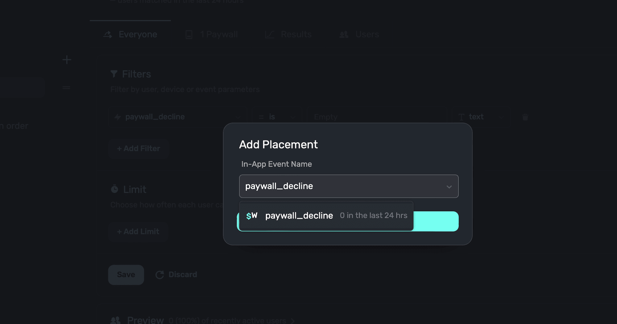 This is registered when a user manually dismisses any paywall. You can combine this with rules to show a paywall when a user closes a specific paywall. First, add the standard placement to a campaign: