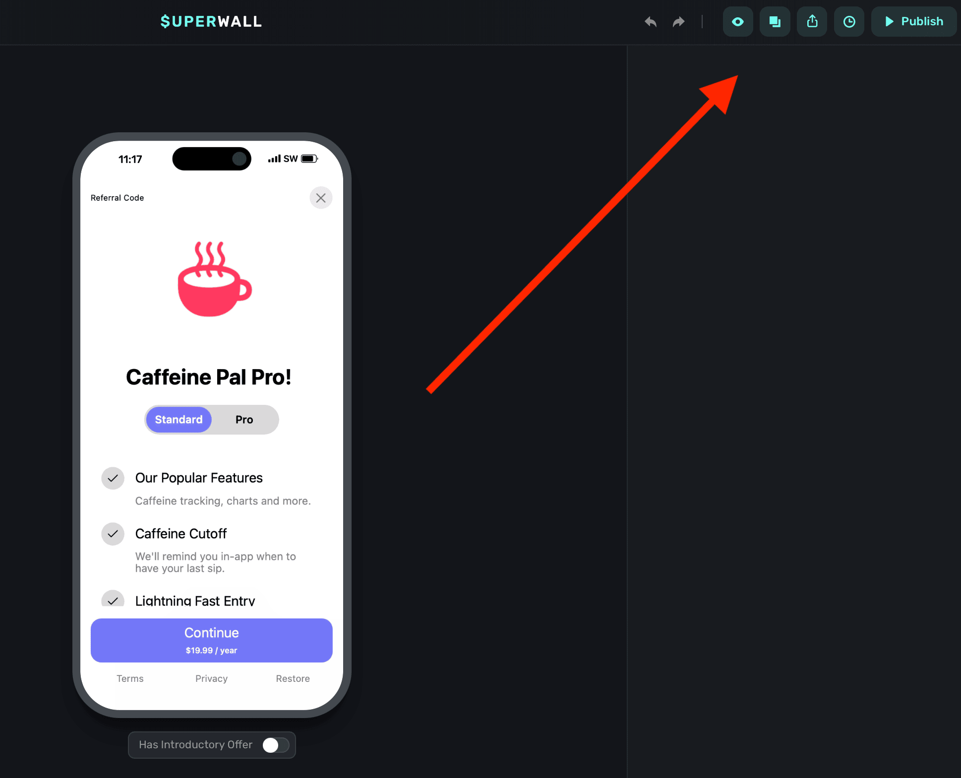 To duplicate a paywall live, click the Duplicate button in the top-right side of the editor: