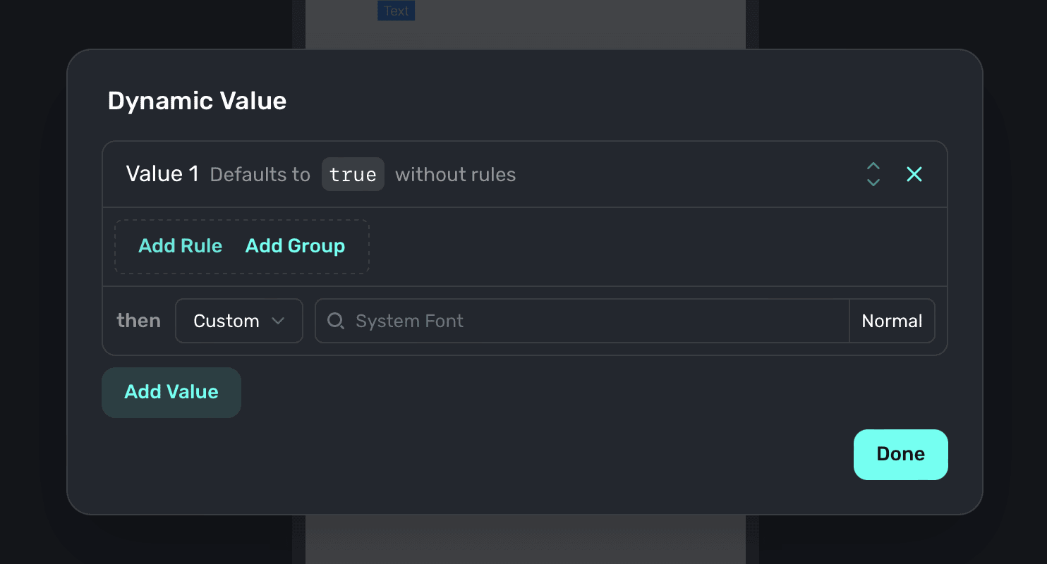 First off, to simply assign a variable without a condition, you still use the dynamic values editor. For example, if you want some text component's color to match something you have in your theme — just select it and don't insert any rule.