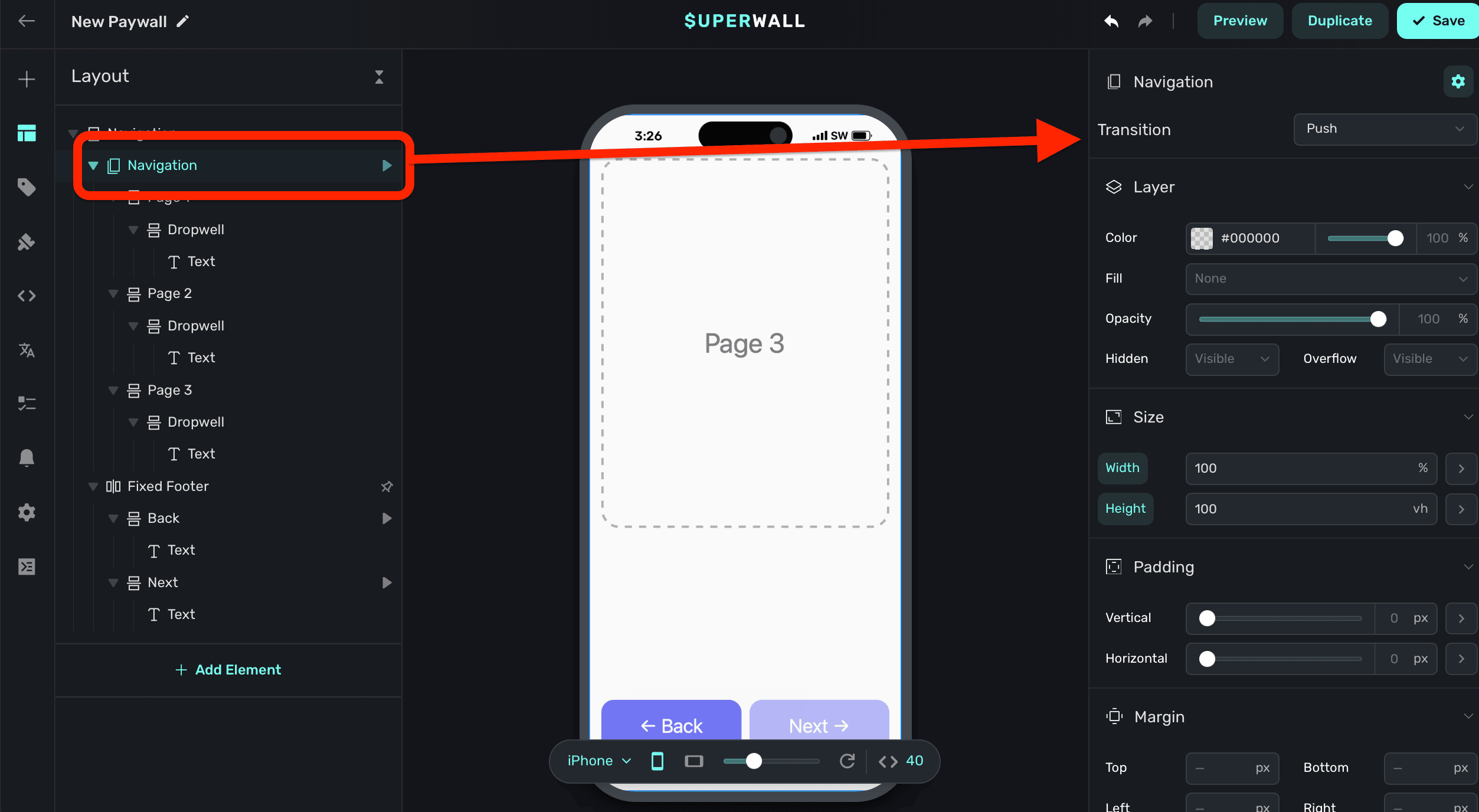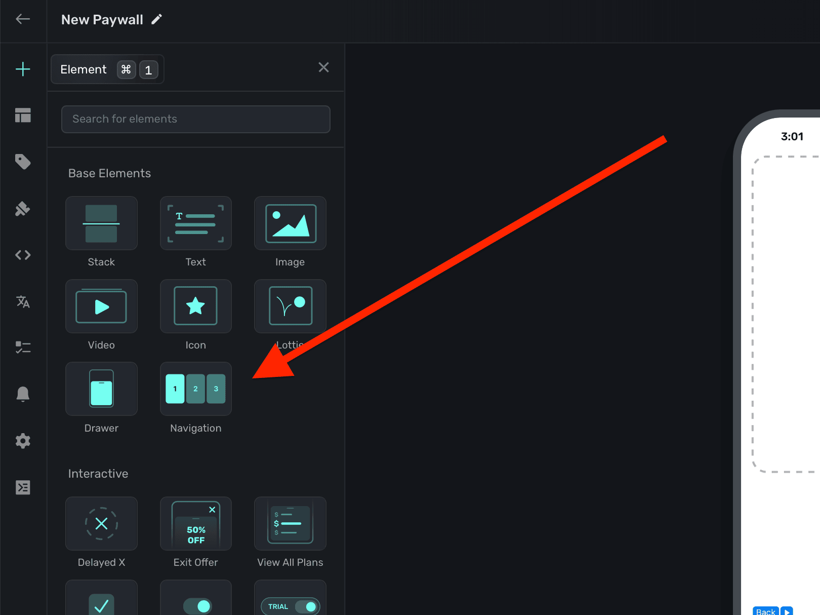 When a navigation element is added, Superwall automatically creates an element variable for it (accessed through the Variables tab in the left sidebar, or the variables button in the floating toolbar). Its name will match whatever is in the element hierarchy in the left sidebar: