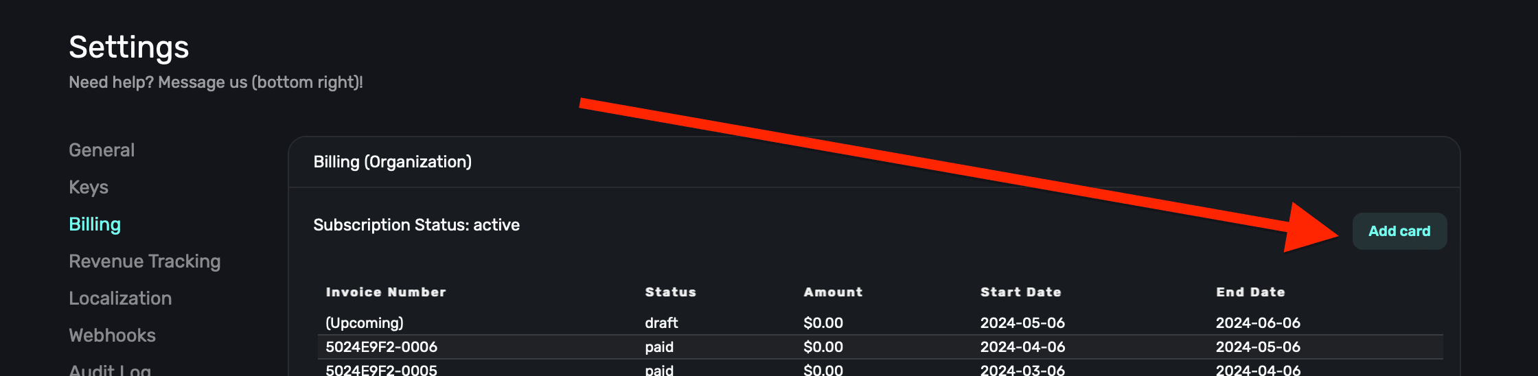 In the Billing section in Settings, you can enter, or change, billing details for your Superwall account: