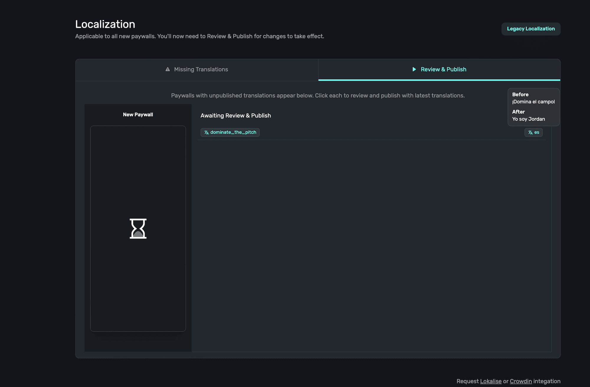 2. Review & Publish: Any localizations that have changed which are used on multiple paywalls (or changed from an external localization provider) show up here. Paywalls using any edited localization key here will continue to use the "old" value it had before it was changed, and you can publish the updates live for the other paywalls after reviewing them.
