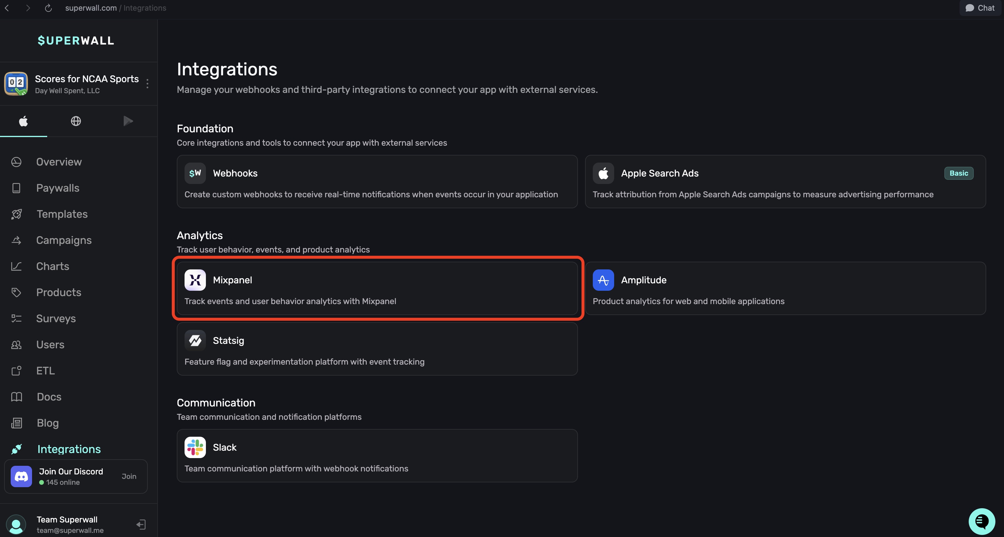 In the Analytics section within Integrations, you can connect your Mixpanel account to Superwall: