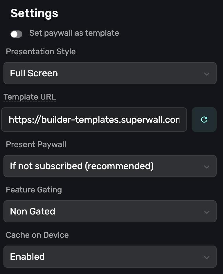 Caching is enabled by default on paywalls. This means that after the first load of a paywall, it will be cached on disk for use next time the app is opened unless you make a change to it on the editor. This greatly reduces network load and the time taken to load paywalls. It does of course increase memory usage of your app so you can turn caching off if you wish by setting Cache on device to Disabled.