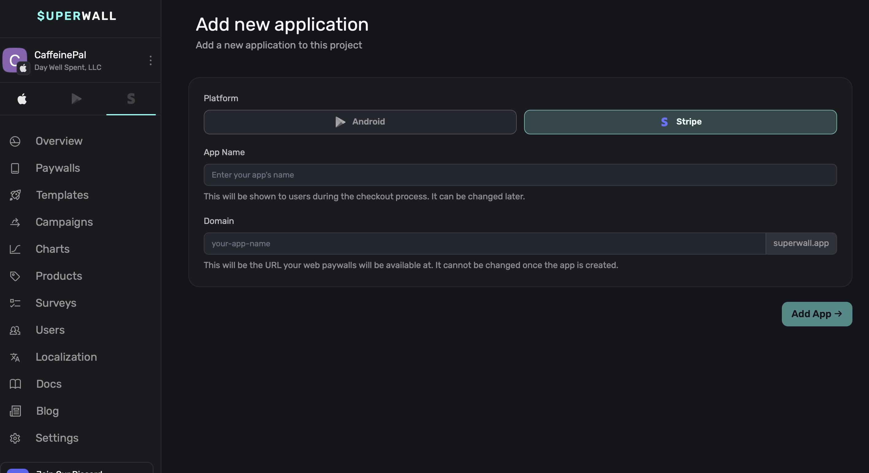 3. Domain: The URL your paywall will be shown from, and superwall.app will be appended to it. You cannot edit this once your app is created.